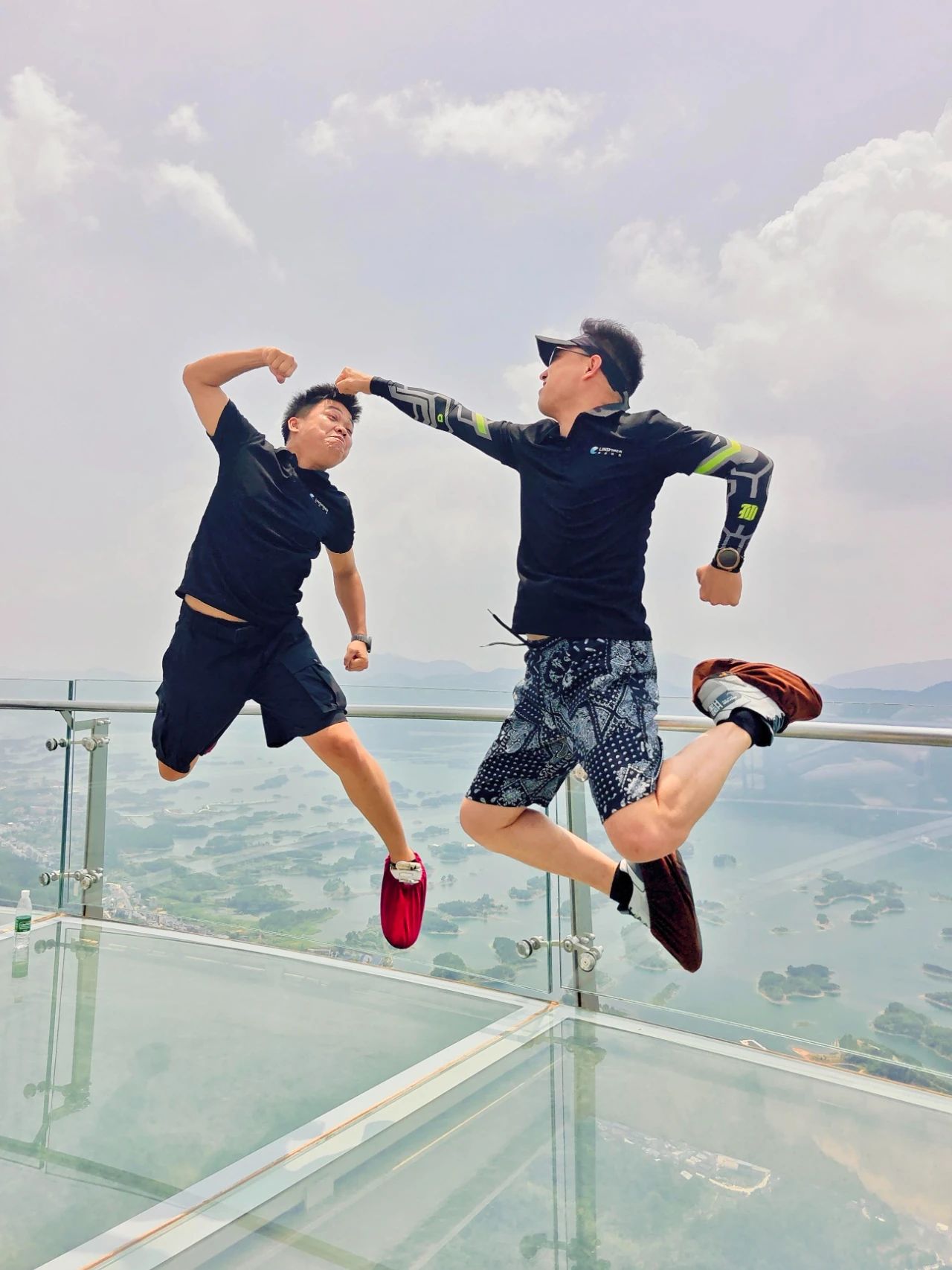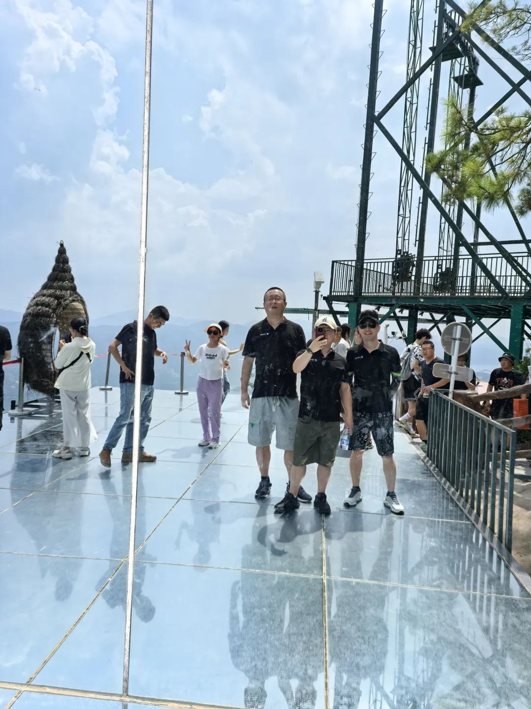 下了船,伙伴们勇闯望仙崖玻璃栈道,在心跳加速中俯瞰湖岛全景,胆大的已经摆起了pose。