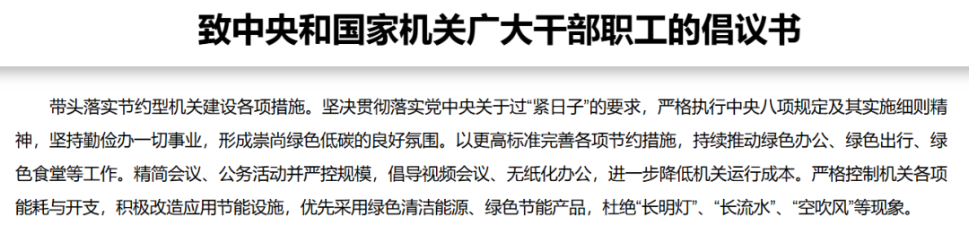 2023年,中央和国家机关工委发布了《致中央和国家机关广大干部职工的倡议书》,提出“节约型机关建设”,持续推动绿色办公。尤其提到了“精简会议、公务活动并严控规模,倡导视频会议、无纸化办公,进一步降低机关运行成本”。