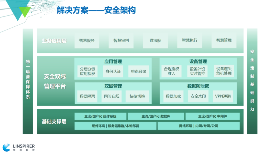 最高人民法院发布的《人民法院信息化建设五年发展规划(2021—2025)》实施至今,全国法院逐步实现了网络联通、业务覆盖、系统融合与数据共享。在智慧法院转型中,信息化推动司法阳光化,《人民法院信息安全保障总体建设方案》提供了宏观指引。但是,即使法院内网、专网和重要应用系统完成了安全测评,物理安全、网络安全、数据安全等问题仍存在,尤其还要防止案件当事人的隐私泄露。在信息化转型过程中,法院还面临着其他挑战。比如各类应用系统尚未整合到统一工作平台,业务流程、系统功能与数据资源之间缺乏深度融合,智能化水平不足;数据安全和云安全建设滞后于应用,信息安全保障体系还需按照网络安全等级保护2.0等有关标准加强。安全是底线。在日常办公中,常见问题就是手机或平板的统一管理,还有个人生活使用能否和工作场景严格区分。南京领创科技自研的双域系统方案已为全国各省市数十家人民法院解决了这一难题。以某市人民法院为例,日常办公使用的是个人手机,有以下代表性的痛点:安全防护体系薄弱:移动执法终端缺乏有效的安全隔离机制,执法数据与个人数据混杂存储,存在敏感信息泄露风险。网络接入能力不足:法院专网在移动互联、跨网协同、泛在接入等方面有待突破,执法人员在外办案时难以安全接入电子政务外网。终端管理手段缺失:无法对执法终端进行统一安全管控,缺乏应用防卸载、通话白名单、一键报警等关键功能。业务系统割裂:各类应用的流程节点、系统功能、数据资源未能全面融合,干警需要频繁切换不同系统,影响工作效率。领创科技经过充分调研、沟通,进行了双域安全系统部署:一方面,通过终端加固、信道加密、认证接入、接入前置设备、网闸隔离、接入控制设备和访问控制,为该法院构建了网络接入安全体系架构,满足司法移动执法办公系统要求(SF/T 0049-2020);另一方面,领创双域系统通过底层系统级隔离技术,实现个人域与工作域的完全隔离。数据隔离:底层数据隔离互不影响,个人数据与执法业务数据物理隔离,防止敏感信息泄露。网络隔离:个人域连接互联网,工作域通过虚拟专网接入电子政务外网。应用隔离:个人应用安装在个人域,工作应用安装在工作域,并可对工作域统一安全管控。工作域按要求内置了常用工作应用,如智慧检察、政务微信、WPS、学习强国等。双域系统方案还有终端功能、硬件和应用的管控,例如专属应用商店只能够下载与使用司法行政安全软件,支持远程静默安装、升级与禁止卸载等功能。双域切换默认无密码,也可以开启密码管控。默认不使用围栏管控,可以选择对工作域进行地理围栏管控,自动切换至工作域模式,也可以选择时间围栏的管控方式。领创双域系统方案实现了对手机/平板的应用、网络、数据等层面的安全可控,一机两用,跟普通手机体验一样流畅。实施后,法院的移动执法安全防护体系全面提升,效率大幅提高,执法人员可随时随地安心处理公务。领创双域终端管控一体化,采用资源动态加载技术,能够有效降低资源占用率,使用体验更好,耗电更少,新机型适配时间也短,已成为司法信息化建设的示范案例。