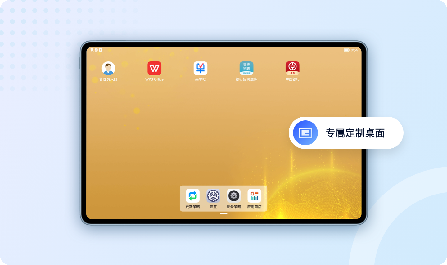 某银行需要对移动展业、移动办公场景的配发设备进行统一管理,专机专用,只能够使用指定的应用,保障信息安全,同时展示银行的品牌信息